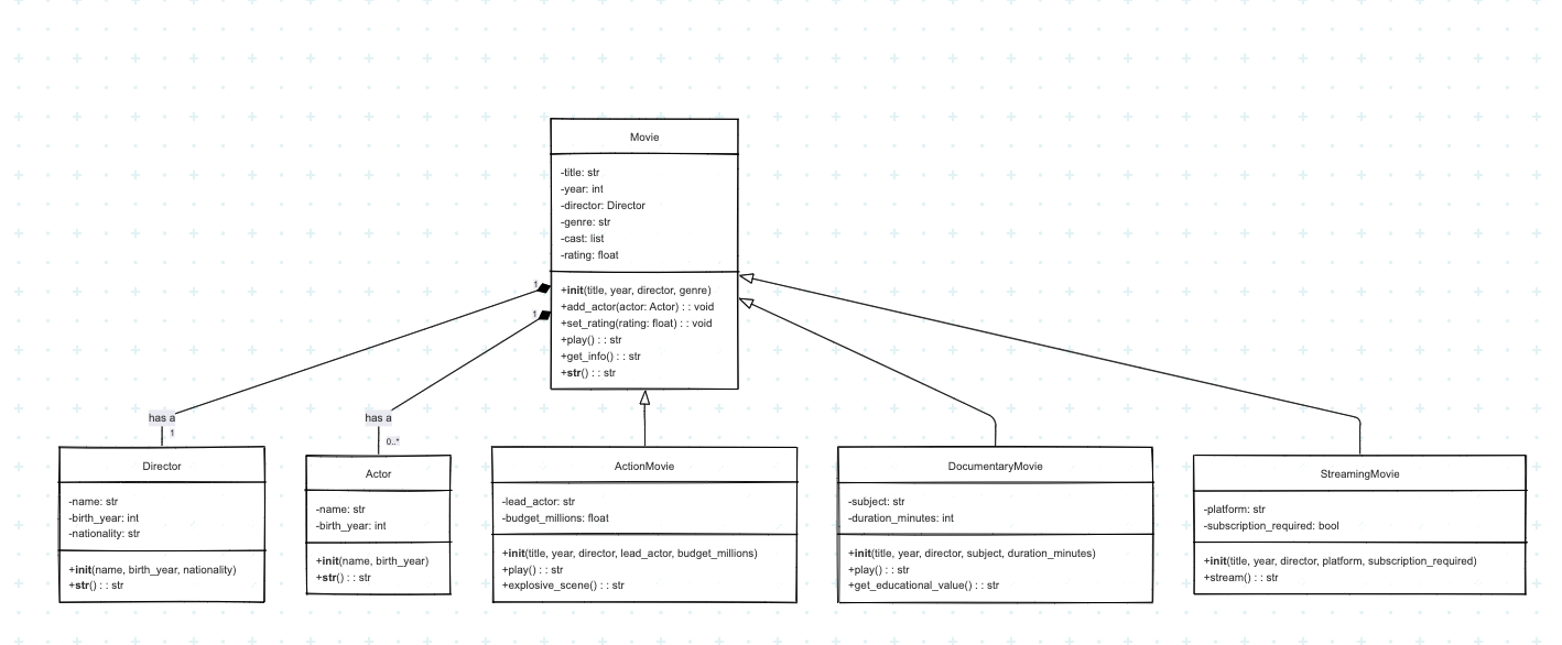 class Director: def __init__(self, name, birth_year): self.name = name self.birth_year = birth_year def __str__(self): return f"Director: {self.name}" class Actor: def __init__(self, name, birth_year): self.name = name self.birth_year = birth_year def __str__(self): return f"Actor: {self.name}" class Movie: def __init__(self, title, year, director): self.title = title self.year = year self.director = director # Movie HAS-A Director self.cast = [] # Movie HAS-A list of Actors def add_actor(self, actor): self.cast.append(actor) def get_credits(self): credits = f"{self.title} ({self.year})\n" credits += f"Directed by: {self.director.name}\n" credits += "Starring: " + ", ".join([actor.name for actor in self.cast]) return credits