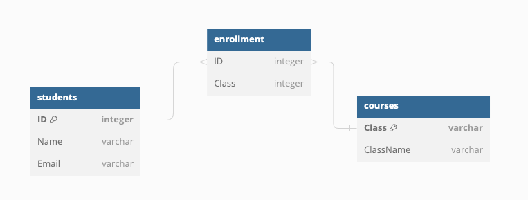 id,name,email,course_id,course 1,Jon,jb@mail.com,GEO101,Intro to Geology 1,Jon,jb@mail.com,MAT200,College Math II 2,Alice,abell@u.edu,BIO250,Intermediate Bio 2,Alice,abell@u.edu,GEO101,Intro to Geology 2,Alice,abell@u.edu,MAT200,College Math II 3,Bob,bob@work.com,BIO250,Intermediate Bio 4,Maria,maria@u2.edu,CSE100,Intro to Python