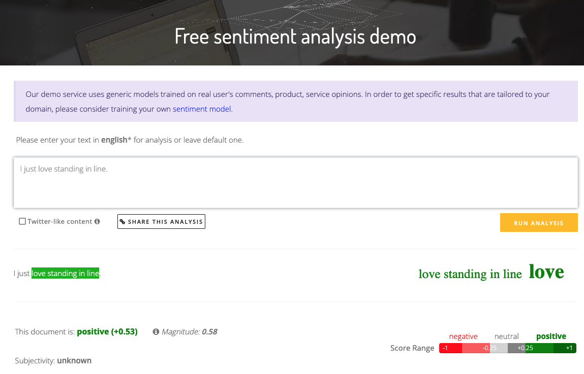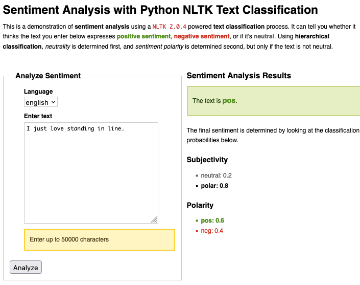 import nltk nltk.download('vader_lexicon') from nltk.sentiment import SentimentIntensityAnalyzer sent = "I just love standing in line." sa = SentimentIntensityAnalyzer() scores = sa.polarity_scores(sent) for k, v in scores.items(): print(f'{k}\t{v}')