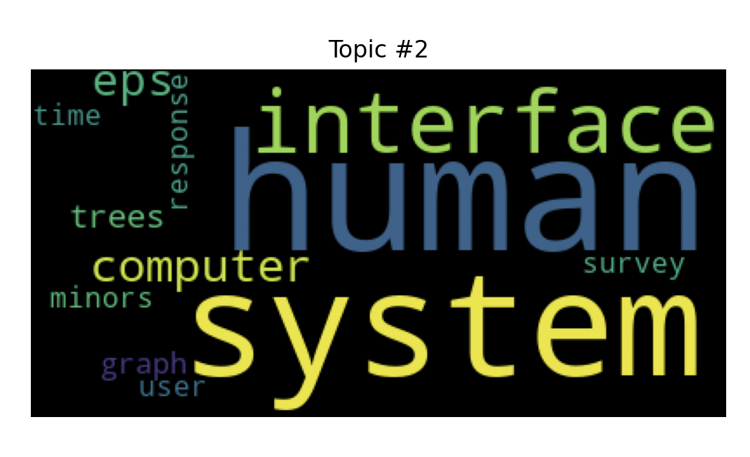import gensim from gensim.test.utils import common_texts from gensim.corpora.dictionary import Dictionary from nltk.corpus import stopwords from wordcloud import WordCloud import matplotlib.pyplot as plt # Remove stopwords from common_texts (optional) stop_words = stopwords.words('english') texts = [[x for x in text if x not in stop_words] for text in common_texts] # create a dictionary from texts and bag-of-words corpus dictionary = Dictionary(texts) corpus = [dictionary.doc2bow(x) for x in texts] # Train an LDA model (adjust num_topics as desired) lda = gensim.models.LdaModel(corpus, num_topics=5, id2word=dictionary) for i in range(lda.num_topics): topic_words = lda.show_topic(i, topn=100) # adjust topn as desired word_weights = dict([(word, weight) for word, weight in topic_words]) wc = WordCloud().fit_words(word_weights) plt.figure() plt.imshow(wc) plt.axis('off') plt.title(f'Topic {i}') plt.show()