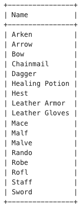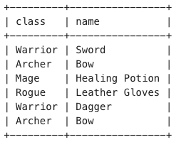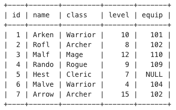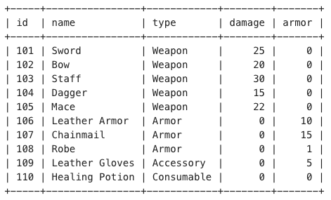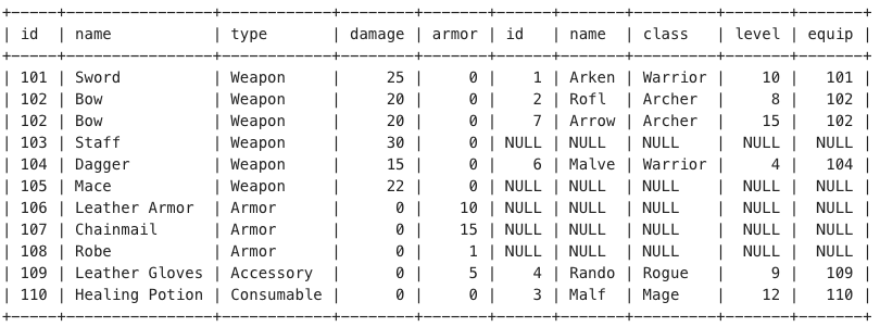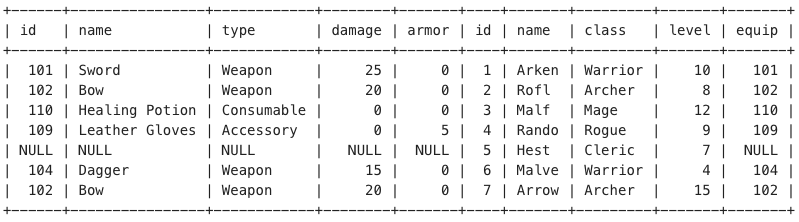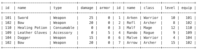 -- Create demonstration tables CREATE TABLE if not exists Equipment ( id INT PRIMARY KEY, name VARCHAR(50), kind VARCHAR(50), damage INT, armor INT ); CREATE TABLE if not exists Characters ( id INT PRIMARY KEY, name VARCHAR(50), class VARCHAR(50), level INT, equip INT, FOREIGN KEY (equip) REFERENCES Equipment(id) ); -- Populate tables with some fake data INSERT INTO Equipment (id, name, kind, damage, armor) VALUES (101, 'Sword', 'Weapon', 25, 0), (102, 'Bow', 'Weapon', 20, 0), (103, 'Staff', 'Weapon', 30, 0), (104, 'Dagger', 'Weapon', 15, 0), (105, 'Mace', 'Weapon', 22, 0), (106, 'Leather Armor', 'Armor', 0, 10), (107, 'Chainmail', 'Armor', 0, 15), (108, 'Robe', 'Armor', 0, 1), (109, 'Leather Gloves', 'Accessory', 0, 5), (110, 'Healing Potion', 'Consumable', 0, 0); INSERT INTO Characters (id, name, class, level, equip) VALUES (1, 'Arken', 'Warrior', 10, 101), (2, 'Rofl', 'Archer', 8, 102), (3, 'Malf', 'Mage', 12, 110), (4, 'Rando', 'Rogue', 9, 109), (5, 'Hest', 'Cleric', 7, NULL), (6, 'Malve', 'Warrior', 4, 104), (7, 'Arrow', 'Archer', 15, 102);