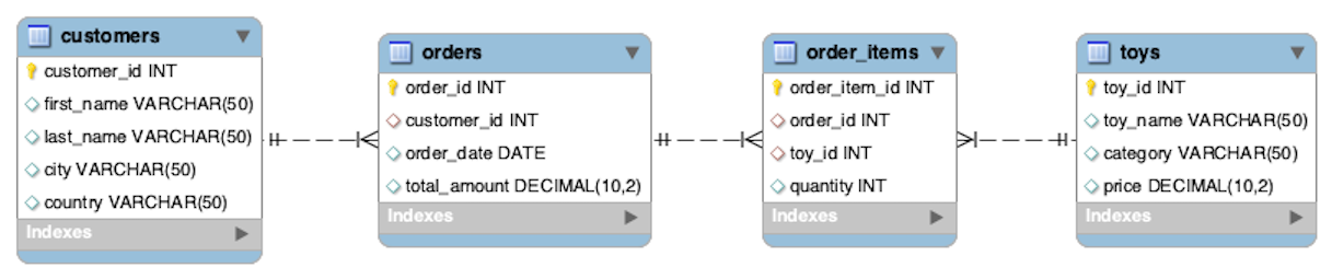 CREATE DATABASE toy_store; USE toy_store; CREATE TABLE customers ( customer_id INT AUTO_INCREMENT PRIMARY KEY, first_name VARCHAR(50), last_name VARCHAR(50), city VARCHAR(50), country VARCHAR(50) ); CREATE TABLE toys ( toy_id INT AUTO_INCREMENT PRIMARY KEY, toy_name VARCHAR(50), category VARCHAR(50), price DECIMAL(10,2) ); CREATE TABLE orders ( order_id INT AUTO_INCREMENT PRIMARY KEY, customer_id INT, order_date DATE, total_amount DECIMAL(10,2), FOREIGN KEY (customer_id) REFERENCES customers(customer_id) ); CREATE TABLE order_items ( order_item_id INT AUTO_INCREMENT PRIMARY KEY, order_id INT, toy_id INT, quantity INT, FOREIGN KEY (order_id) REFERENCES orders(order_id), FOREIGN KEY (toy_id) REFERENCES toys(toy_id) ); INSERT INTO customers (first_name, last_name, city, country) VALUES ('Michael', 'Jordan', 'Chicago', 'USA'), ('Jennifer', 'Lopez', 'Los Angeles', 'USA'), ('David', 'Beckham', 'London', 'UK'), ('Sophia', 'Loren', 'Rome', 'Italy'), ('Jackie', 'Chan', 'Hong Kong', 'China'), ('Penelope', 'Cruz', 'Madrid', 'Spain'), ('Brad', 'Pitt', 'New Orleans', 'USA'), ('Angelina', 'Jolie', 'Los Angeles', 'USA'), ('Tom', 'Cruise', 'New York', 'USA'), ('Nicole', 'Kidman', 'Sydney', 'Australia'); INSERT INTO toys (toy_name, category, price) VALUES ('Play-Doh Colors', 'Arts & Crafts', 14.99), ('Lego City', 'Building Blocks', 79.99), ('Barbie Dreamhouse', 'Doll', 129.99), ('Hot Wheels Track Set', 'Vehicles', 34.99), ('Teddy Bear Plush', 'Plush', 24.99), ('Puzzle 1000 Pieces', 'Games', 19.99), ('Board Game Monopoly', 'Games', 39.99), ('Remote Control Helicopter', 'Vehicles', 59.99), ('Baby Doll', 'Doll', 19.99), ('Action Figure Set', 'Action Figures', 29.99); INSERT INTO orders (customer_id, order_date, total_amount) VALUES (2, '2023-11-22', 180.00), (3, '2023-12-03', 250.00), (4, '2023-11-18', 120.00), (5, '2023-12-12', 300.00), (6, '2023-11-25', 150.00), (7, '2023-12-01', 220.00), (8, '2023-11-19', 180.00), (9, '2023-12-04', 250.00), (10, '2023-11-23', 120.00); INSERT INTO order_items (order_id, toy_id, quantity) VALUES (2, 3, 1), (2, 4, 2), (3, 5, 3), (3, 6, 1), (4, 7, 2), (4, 8, 1), (5, 9, 4), (5, 10, 2), (6, 1, 3), (6, 2, 1);
